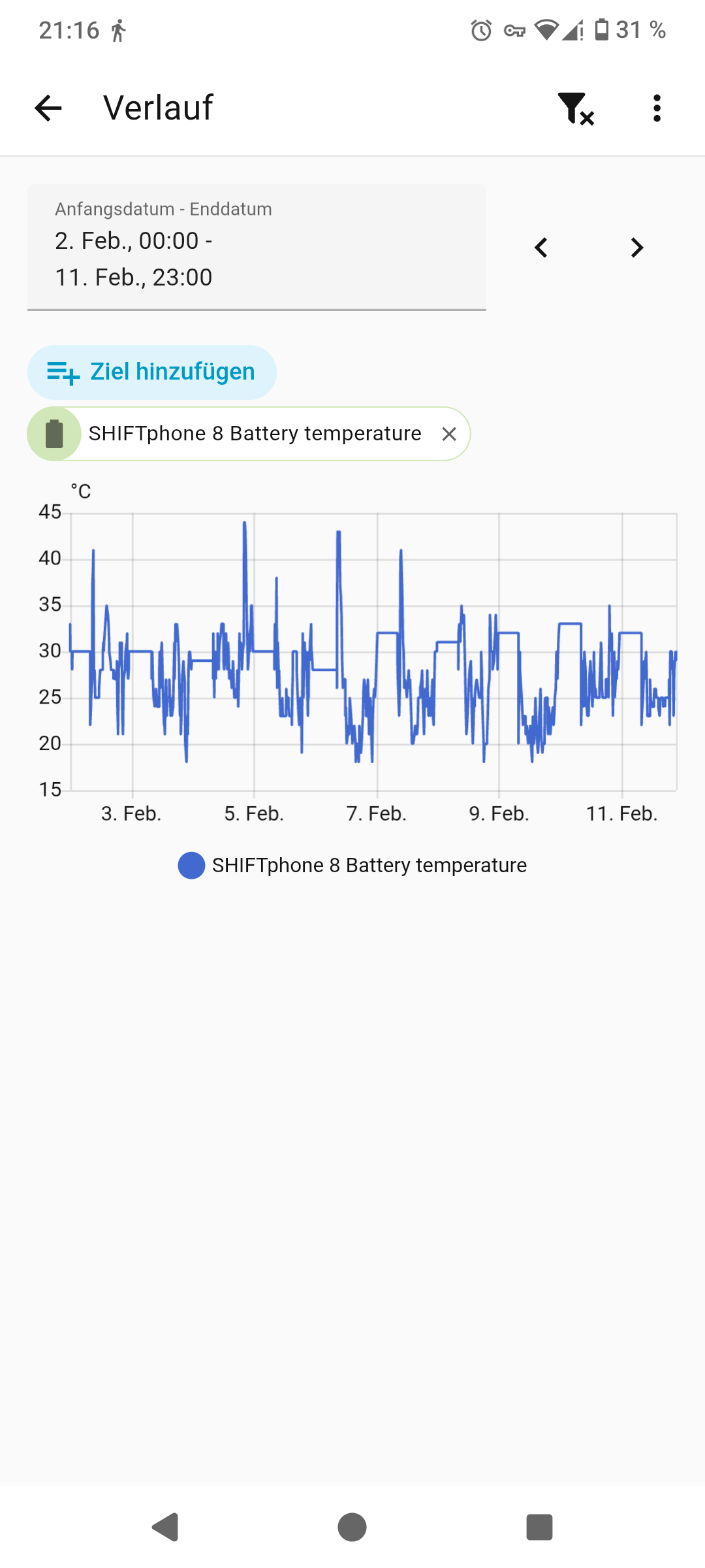 Das ist, was mein Home Assistant über die letzten Tage aufgezeichnet hat. Komme beim Laden also in der Spitze auch über 40°C.