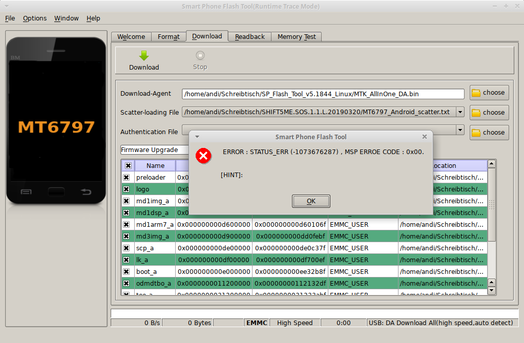 Unter Mint startete dann endlich die flash_tool.sh, konnte auch mit dem flashen starten, aber das hängt sich dann immer wieder auf, egal ob als normaler user oder ob unter sudo. Mittlerweile scheint auf dem shift5me alles gelöscht zu sein, da ich es nicht mehr gestartet bekomme, auch nicht mit der Lautstärke-down und dem Startknopf. Beim Flashen zunächst lädt er die "Download DA 100%" in rot, dann erscheint in weiss "Format 0%" woran sich dann auch für ca. 4 Minuten nichts ändert, worauf hin dann die Fehlermeldung "